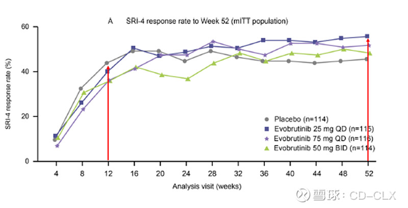 之前有人提到奥布替尼的疗效看起来远不如泰它西普,其实我感觉倒不一定。有两个图,第一张是Evobrutinib的SRI-4随时间变化的趋势,可以看出疗效从12周到52周还是有不小的提升,那大概可以预测奥布替尼在52周的疗效要比现在观察到的要好;另一张图是泰它西普III期试验中观察到的SRI-4随时间变化的趋势,如果对比12周SRI-4 12周的结果,泰它西普和奥布替尼看起来都差不多60%左右。不过对于奥布替尼不需要要求那么高,只要SRI-4能够达到70%,相比安慰剂能超过30%左右,那未来作为第一个口服靶向BTKi治疗SLE药物,一定有它的一席之地。