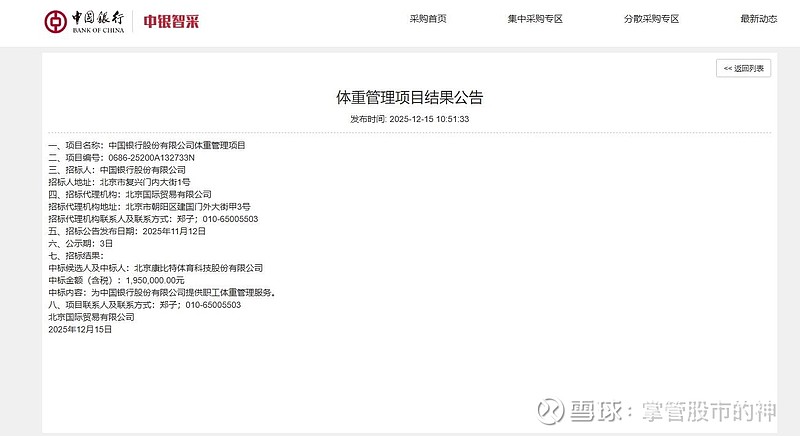 重大利好!康比特大单来了!中国银行官网公布体重管理项目结果公告,康比特中标其为职工提供的体重管理服务项目,中标金额195万元!真的建议以后国央企都得搞这个,既当员工福利,还刺激消费。既是响应国家政策,又能宽慰员工。发米发油也发福,还不如给送健康,为中行点赞!$康比特(BJ920429)$