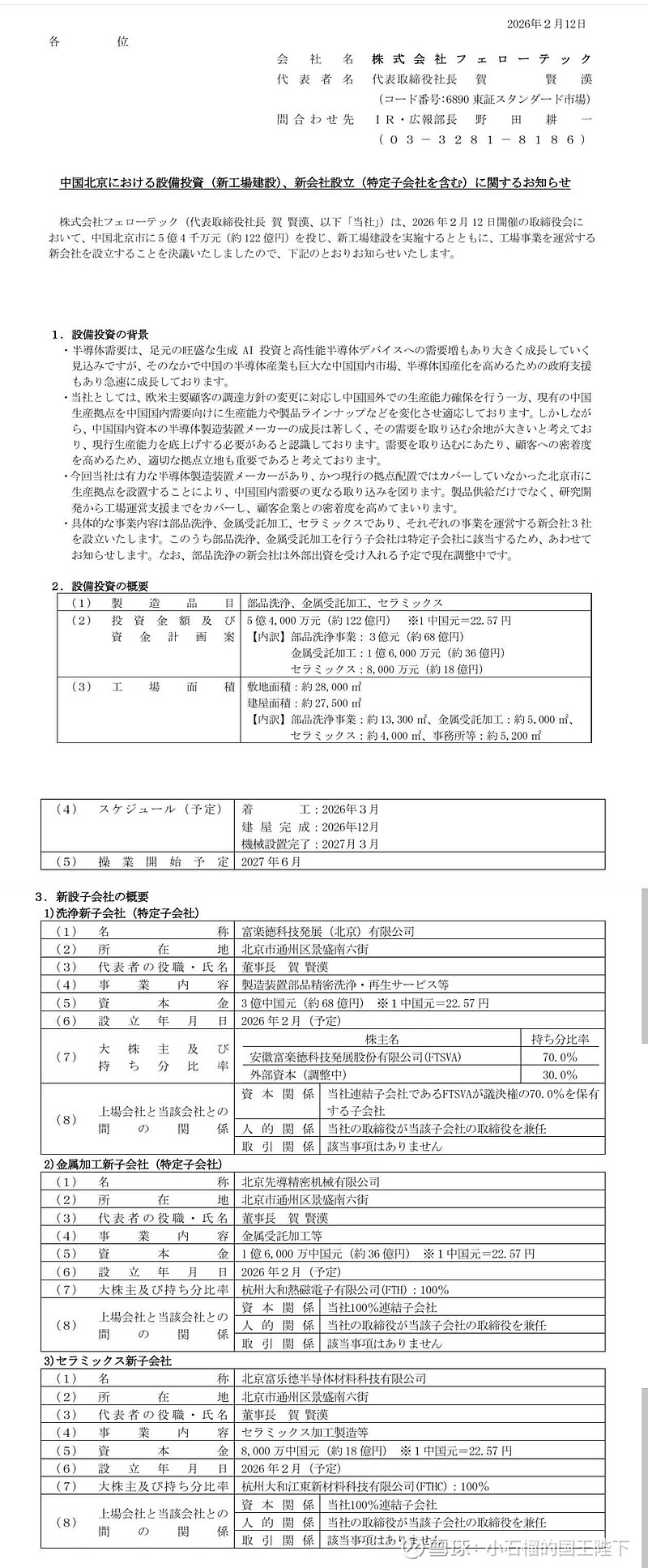 1. 投资主体与规模:日本Ferrotec(菲罗泰克,东证6890)于2026年2月12日决议,在北京投资5.4亿元(约122亿日元)建设新工厂,设立3家新子公司,聚焦半导体部件清洗、金属受托加工、半导体材料加工三大业务。