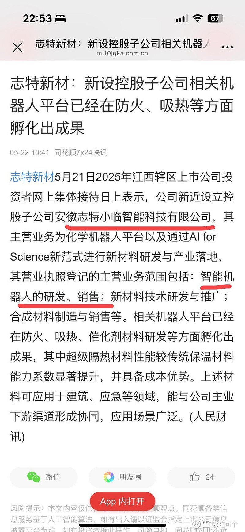 四,最后还有个隐藏彩蛋,大家都关注隔热材料了,没注意公司名字吧,志特小临智能科技公司,不是单纯的材料公司,先看经营范围,放最前面的经营范围就是机器人研发销售,又一次站在风口了。