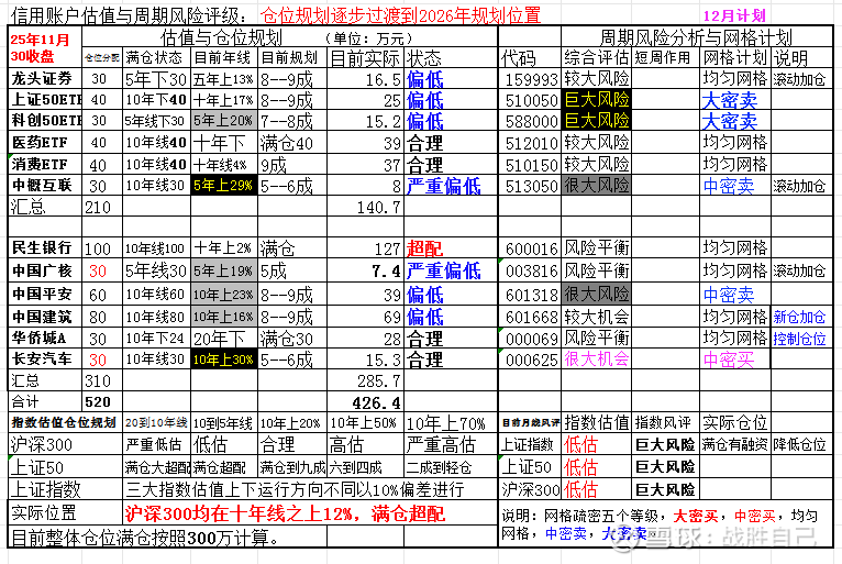 还有一个月收出年线,实践仓位目前年度是增加的,对应年线上涨应该降低仓位相违背,视频讲解时,也有朋友提出质疑。一是年度收益增加四十多万,对应明年本金也是增加的。二是个股今年上涨带来风险评级大部分落后指数,仓位出现一定偏离。目前还是在长期仓位规划理论偏离度内。十二月网格计划如下。