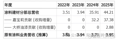 2025 年营收小幅回调,很明显是房地产开工量下滑闹的。拆开看更清楚:石膏板收入同比降了 8.73%,比行业整体 2.7% 的跌幅还要大,说明高端公装市场受冲击更明显。全年营收没崩,主要靠涂料业务撑着,但细拆一下就会发现:剔除大桥油漆、嘉宝莉这些收购并表的部分,公司原本自己的涂料业务其实是停滞甚至萎缩的。这也很现实 —— 行业不好的时候,头部企业想增长,很多时候只能靠 “吃掉别人”。