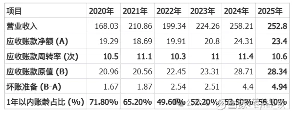 坏账计提变多:坏账准备从 2020 年的 1.67 亿涨到 2025 年的 4.94 亿,光是 2025 年就新增计提了 0.62 亿;