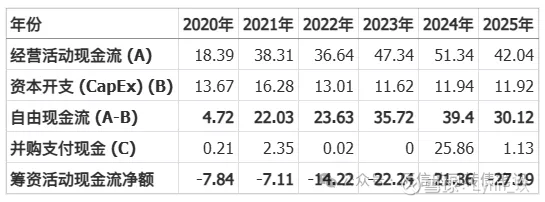更厉害的是它的 “自我造血” 能力 。公司扩张基本不靠外面借钱融资,全靠自己赚的钱往里投,甚至还能持续给股东和债权人分钱。2024 年它花了大约 25.86 亿收购嘉宝莉,算是大手笔了,但当年经营现金流 51.34 亿,付完并购款和日常开支,还剩 13 个亿以上。过去六年自由现金流一直是正的,还在慢慢往上走,这种内生增长的公司,安全感真的很强。