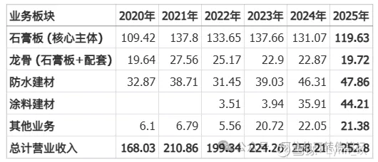 再看产能和运营,公司还算务实。2025 年石膏板产能利用率 60.36%,防水 53.17%,涂料 56.52%,整体不算高。但这并不是经营不善,更像是 “以销定产”,不盲目扩产压库存,再加上这几年国内外新建产能不少,暂时没完全消化,行业整体需求也弱,利用率偏低可以理解。