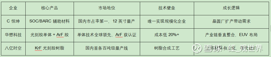 3. 光刻胶辅助材料:SOC/BARC、单体等,国内市占率第一,重点关注 C 恒坤、华懋科技;