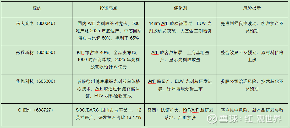 1. ArF 光刻胶:替代空间 45 亿元(2025 年)→100 亿元(2030 年),复合增速 22%,重点关注南大光电、鼎龙股份;