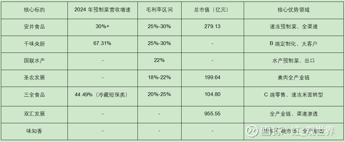 2. 细分赛道龙头:千味央厨(B 端定制化)、国联水产(水产预制菜)、三全食品(C 端健康化)等企业,聚焦细分领域形成差异化竞争优势,成长弹性更大;