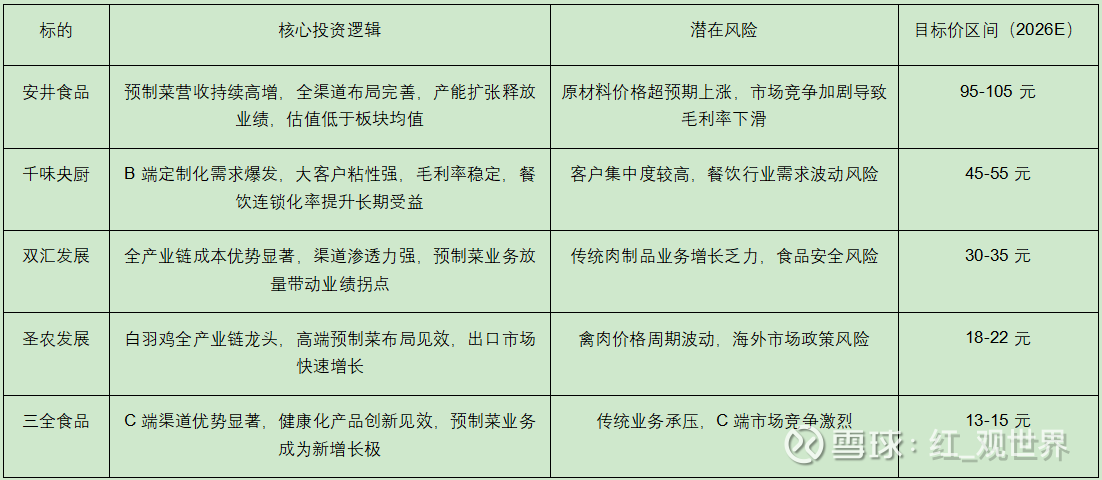 3. 配置策略:短期可关注估值处于历史低位的龙头企业(如安井食品、圣农发展),长期可布局研发创新能力突出、海外市场拓展见效的企业(如国联水产、千味央厨)。