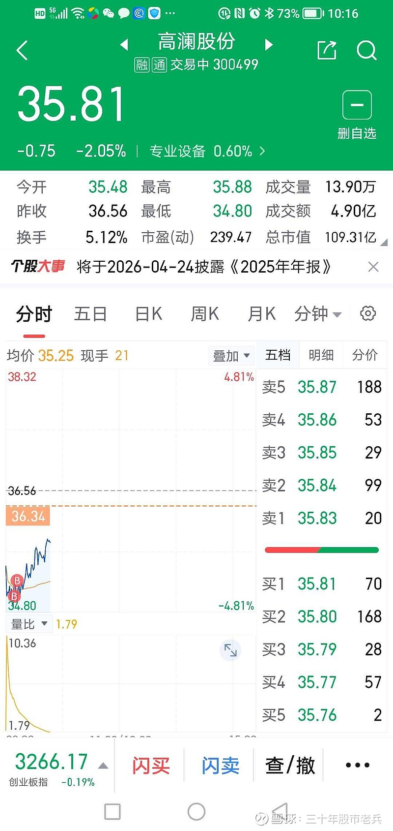 :股价创3月9日建仓以来新低,今天上午在34.98与35.36加了仓。