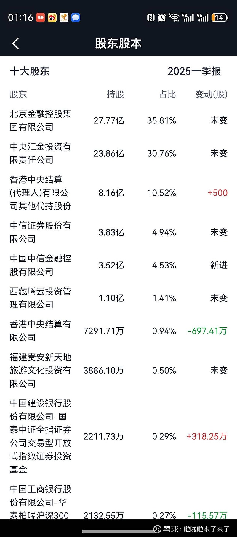 $中信证券(SH600030)$ $中信建投(SH601066)$ 该有多长时间没关注中信建投了,才发现2025年一季度中信金控已经成为中信建投的第五大股东了。也就是中信证券和中信金控合计已经持有9.47%的股份。中信金控是在25年1季度成为中信建投的第五大股东,背后含义不用说了,明牌啊。不等到结果,绝不退出。