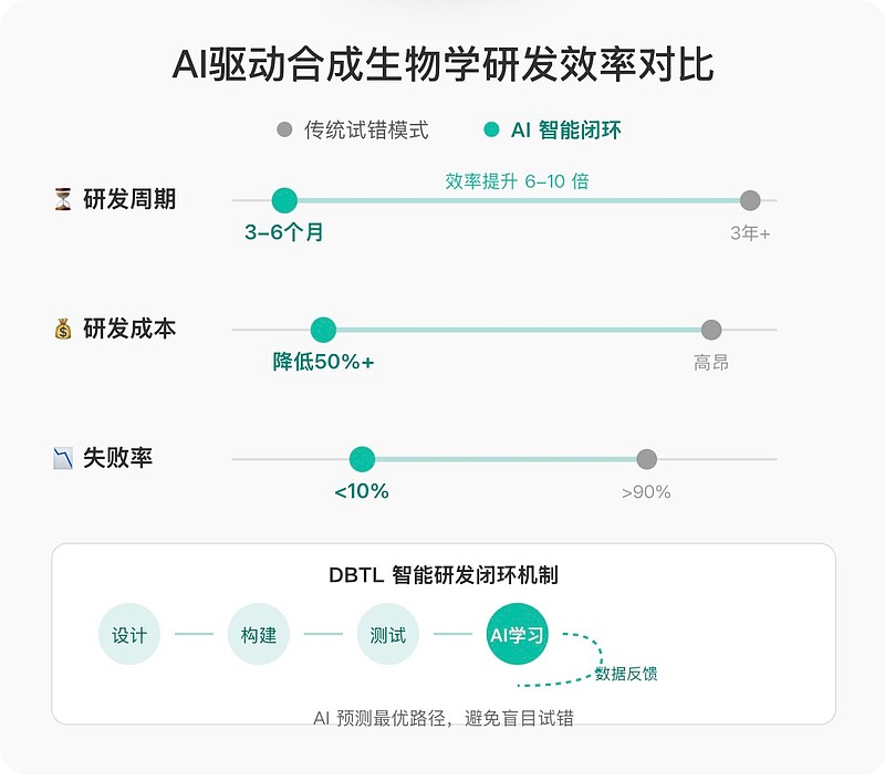 过去,合成生物学的发展受限于“试错”模式:设计一条代谢通路如同猜密码,构建菌株、测试产量耗时数年,失败率极高。如今,AI的介入彻底改写了游戏规则。AI能够预测蛋白质结构、优化基因编辑方案、模拟复杂的代谢网络,将原本需要数年的研发周期压缩至数月甚至数周。一个“设计-构建-测试-学习”的智能化闭环正在形成,研发效率提升可达10到100倍。