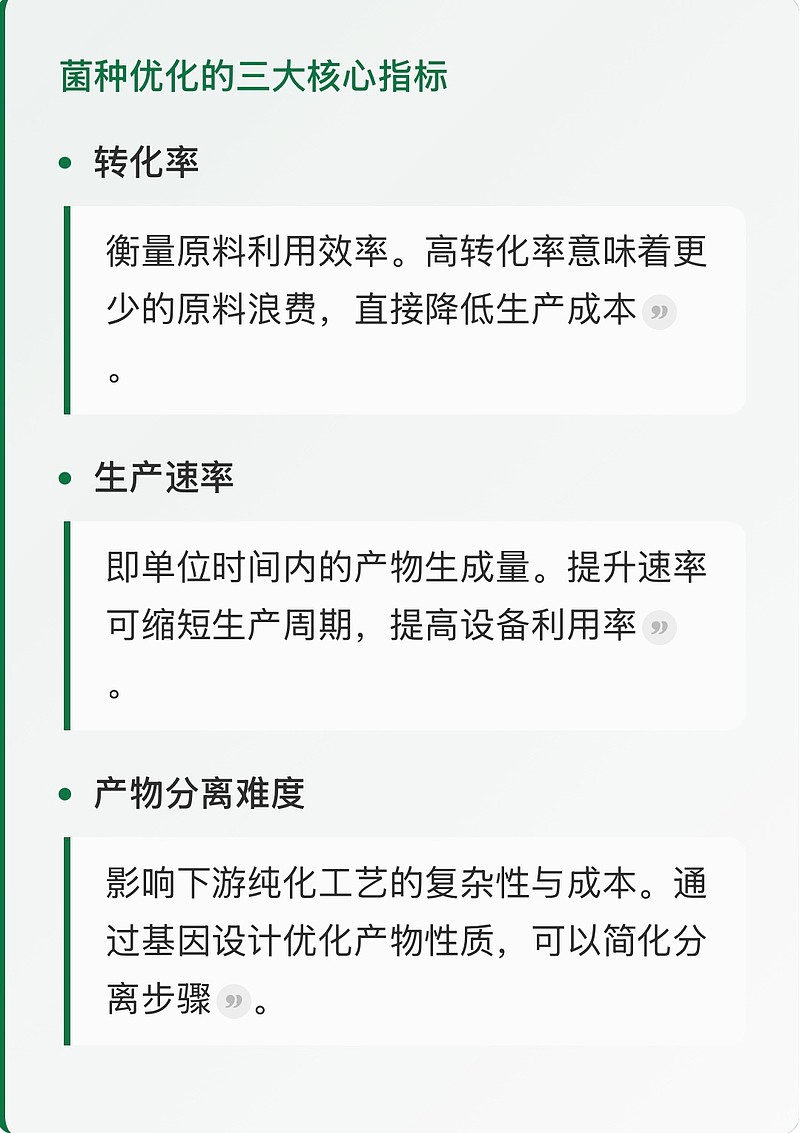 菌种是合成生物学的“生产机器”,其性能直接决定了整个制造过程的效率与成本。传统的工业菌株往往生长缓慢、代谢复杂、难以改造。AI驱动的理性设计,结合高通量筛选与自动化实验平台,正在攻克这些难题。通过精准调控代谢通路,AI能帮助工程师们聚焦于提升菌种的三大核心指标:转化率、生产速率和产物分离难度。