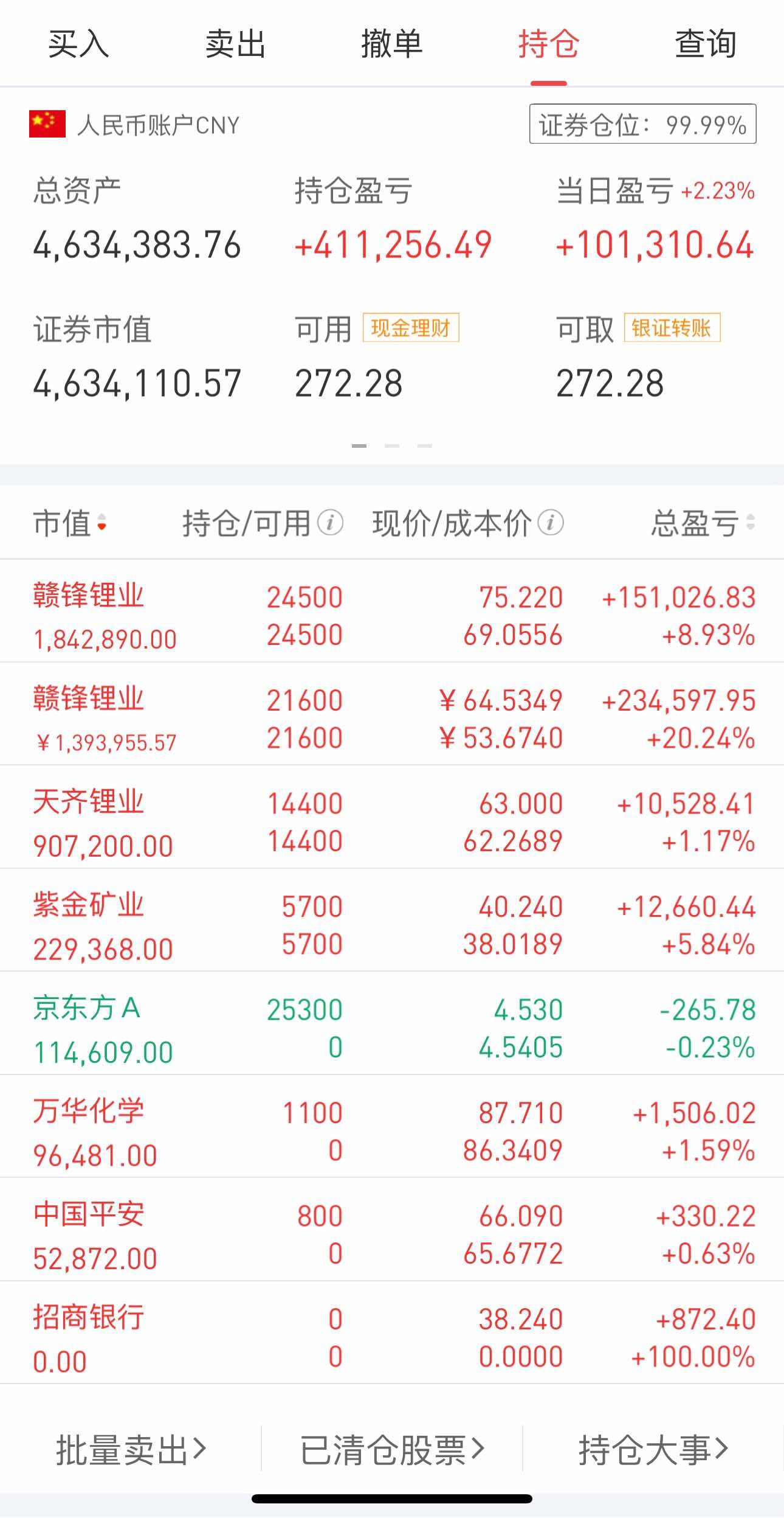 现在媳妇的账号基本全是锂矿。我的小账号基本全是黄金。搭配一点非主线景气度行业如面板,化工,油运,保险。