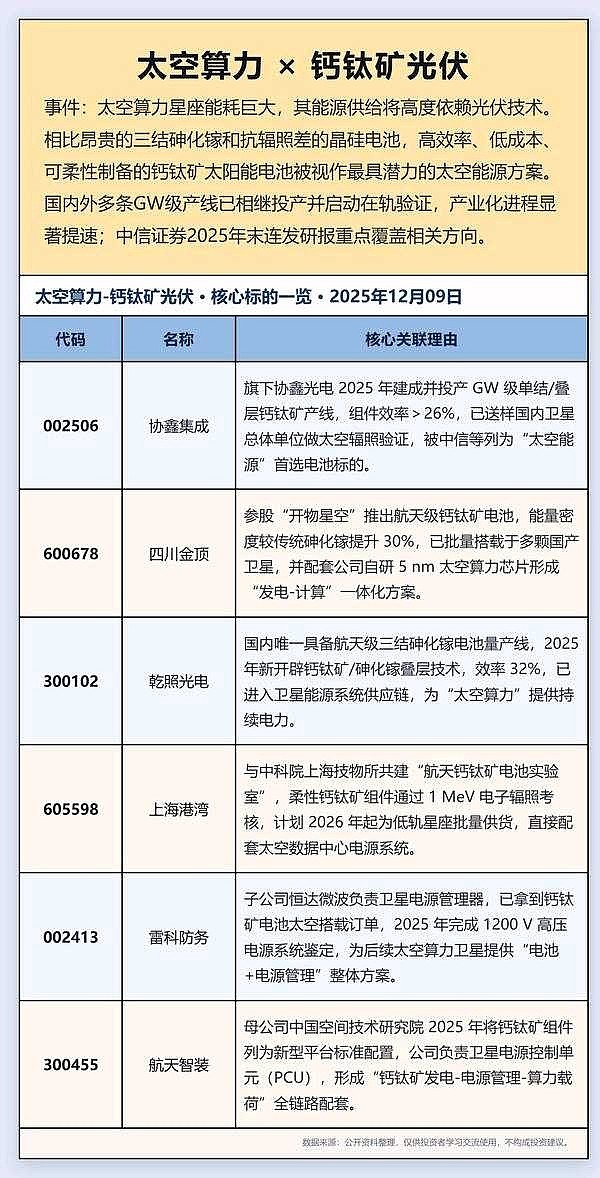$雷科防务(SZ002413)$ 雷科防务,太空算力星座能耗巨大,能源供给将高度依赖光伏。相较三结砷化镓成本高、晶硅抗辐照不足,钙钛矿电池高效低成本、可柔性制备,GW级产线投产并启动在轨验证,产业化加速。雷科防务子公司恒达微波负责卫星电源管理器,已拿到钙钛矿电池太空搭载订单,2025年完成1200 V高压电源系统鉴定,为后续太空算力卫星提供"电池+电源管理"整体方案。