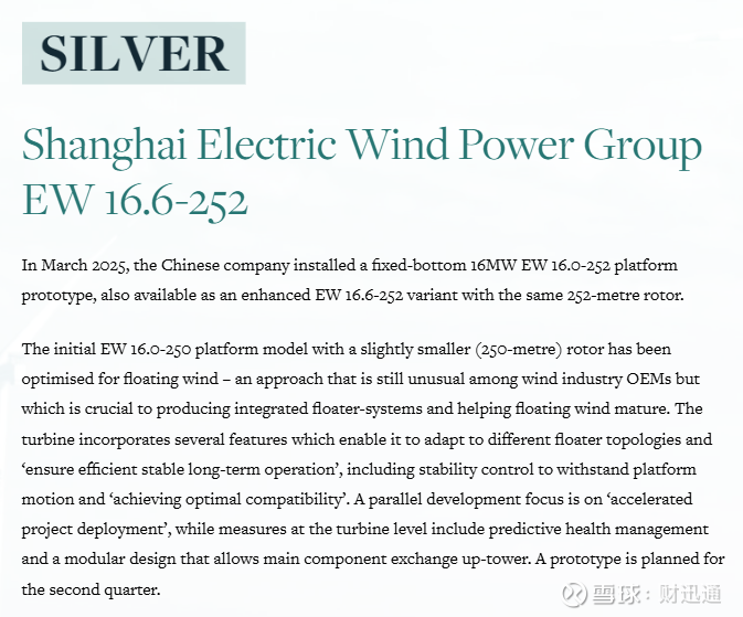 近日,国际权威风能杂志Windpower Monthly揭晓“2025年度最佳风电机组”名单。电气风电(688660.SH)共有三款海陆产品上榜,分别入选全球最佳陆上风电机组(6.9MW以下)、全球最佳陆上风电机组(7.0MW以上)以及全球最佳海上风电机组。其中,EW16.0-252海上机组摘获全球最佳海上风电机组榜单银奖。