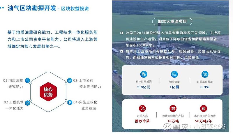 公司官网产品和服务中显示,加拿大重油项目地质储量1亿桶,目前已开采0.9%;未来目标产能预计50万吨/年