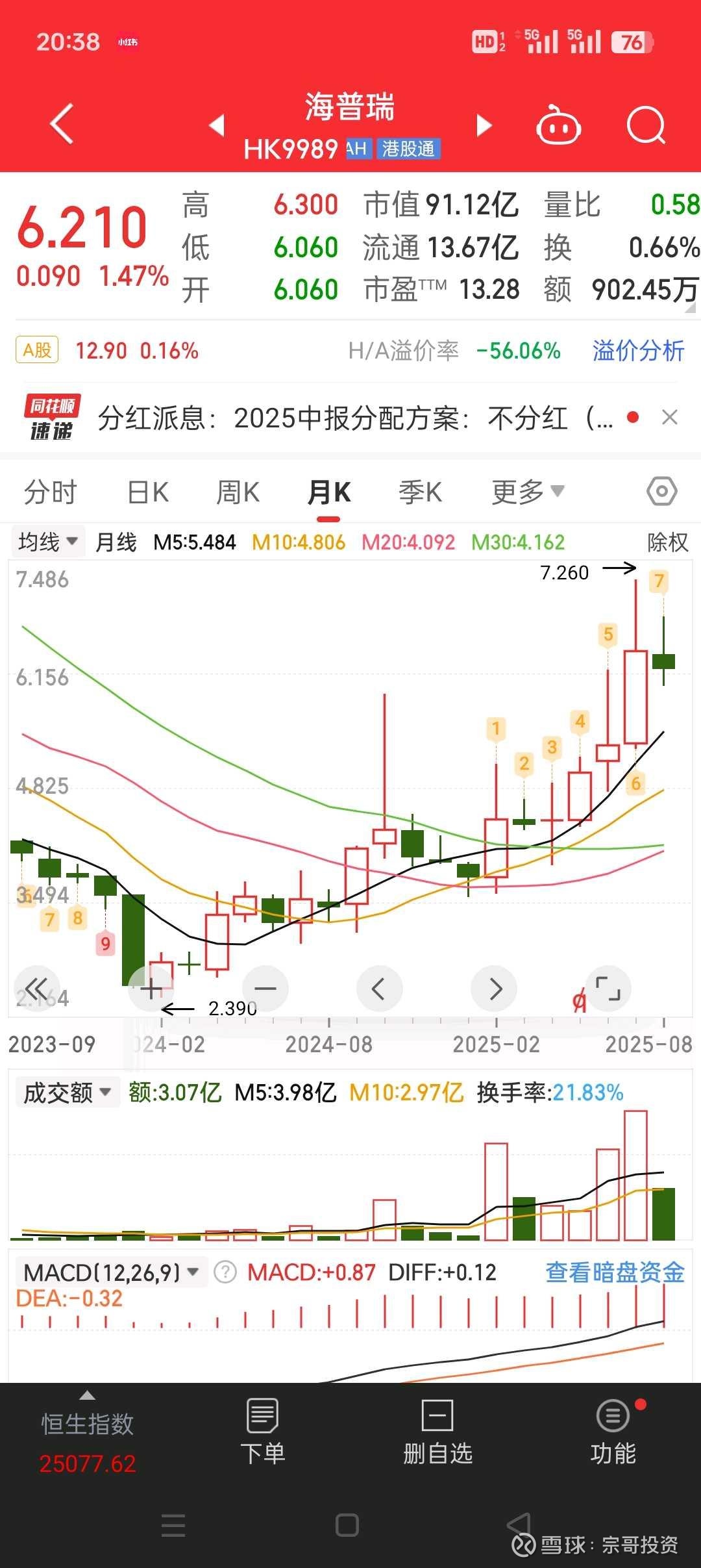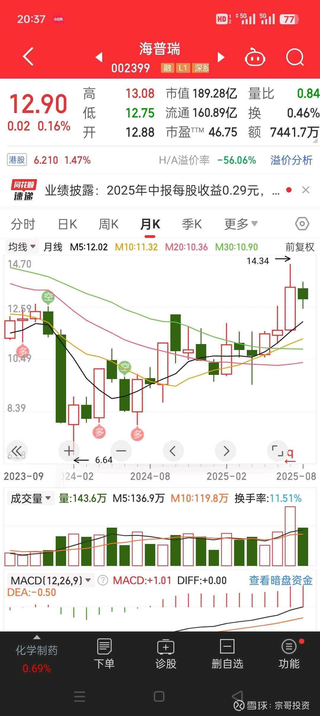 当前港股(09989.HK)股价6.21港元,对应PE 12.86倍、PB 1.54倍,显著低于全球生物制药行业均值(PE 25倍、PB 3倍)。A股(002399.SZ)溢价率161.1%,港股性价比凸显 。若创新药管线兑现预期,PE有望修复至20倍以上,对应港股目标价9.3港元,上行空间50%。