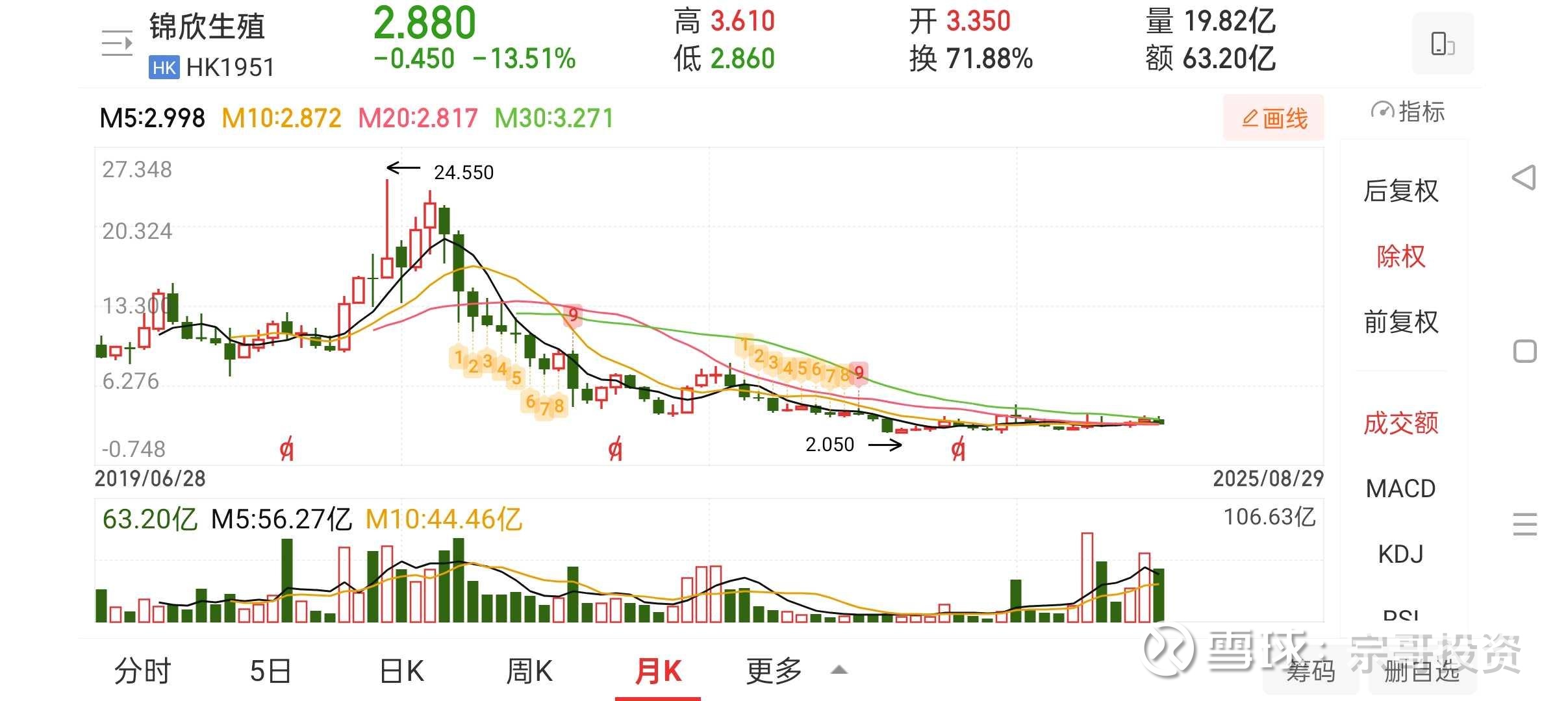 2025年8月29日锦欣生殖收盘价2.88港元。