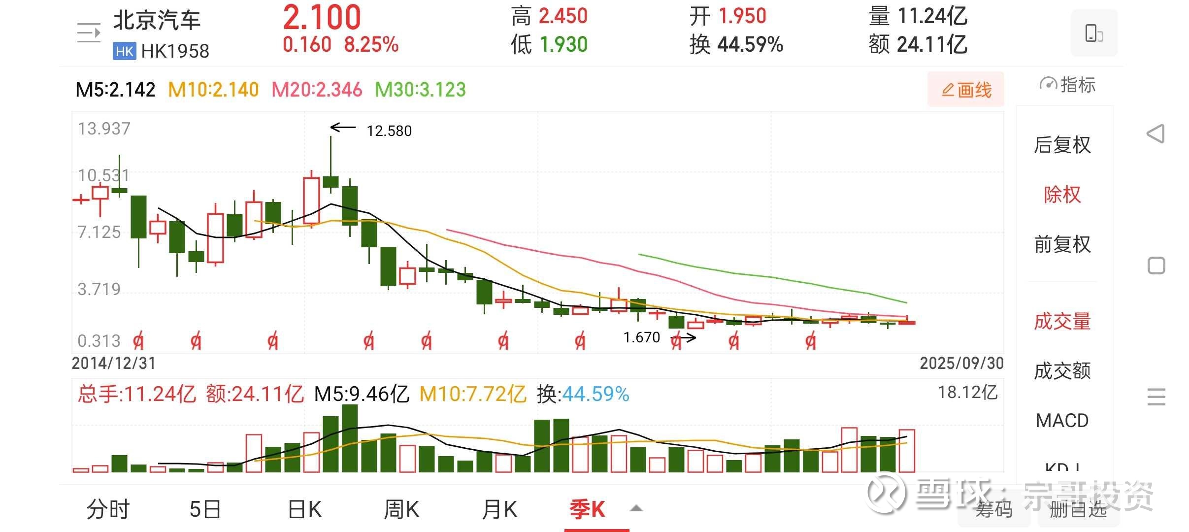 北京汽车的专属熊市周期股价12.58港元,下跌到1.67港元,