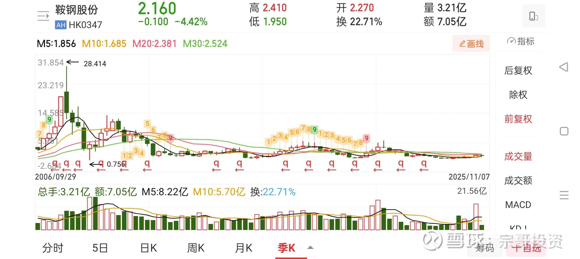 历史顶部2007年那时,鞍钢股份港股,历史最高股价28.414港元。