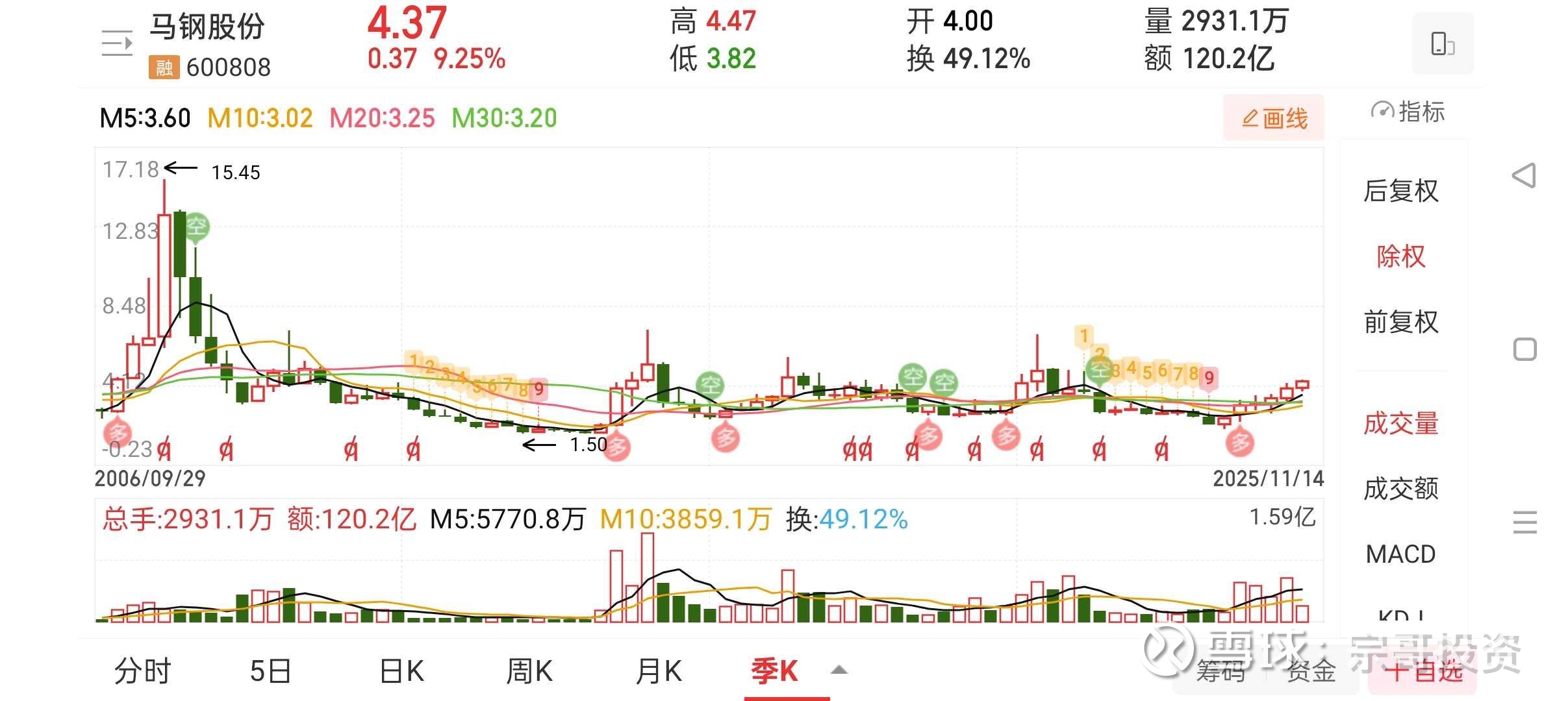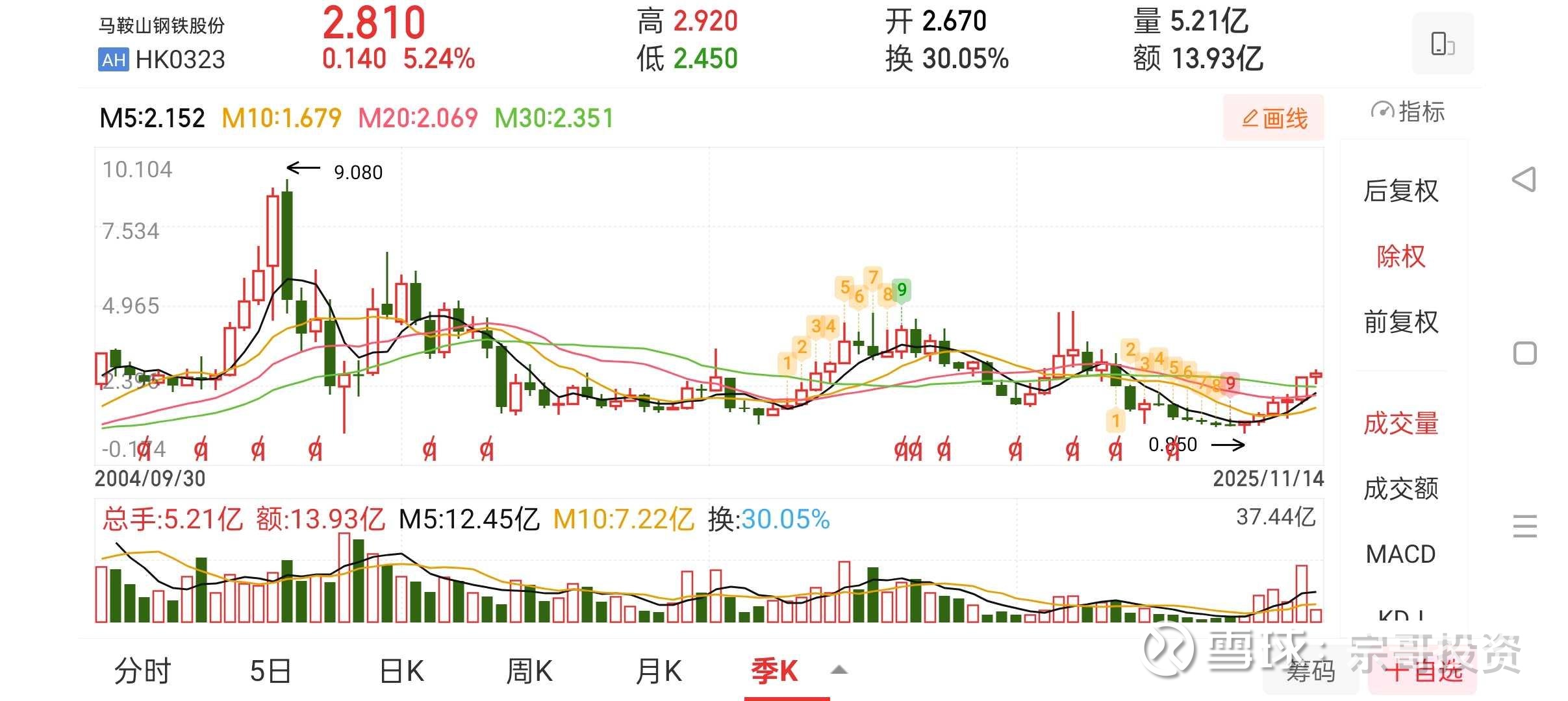 截至2025年7月,马钢股份AH溢价率达99.03%,港股股价较A股折价超50%,显著低于行业平均水平(通常港股折价20%-30%)。这种估值分化主要源于市场对其历史亏损的担忧,但随着公司经营改善,港股存在强烈的价值回归预期。从财务数据看,2025年第三季度公司归母净利润扭亏为盈至1.58亿元,经营活动现金流净 同比增长69.6%至43.24亿元,盈利能力边际改善明显 。若未来业绩持续修复,港股估值有望向A股靠拢,带来资本增值机会。