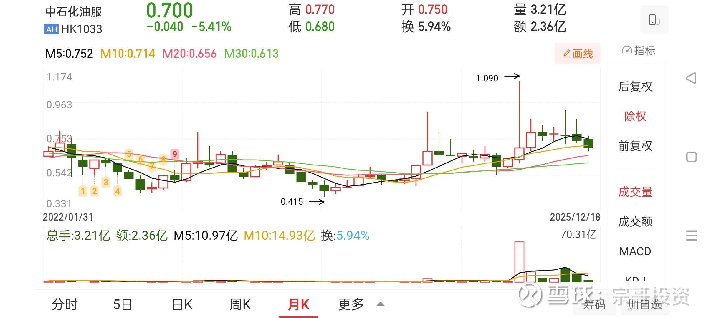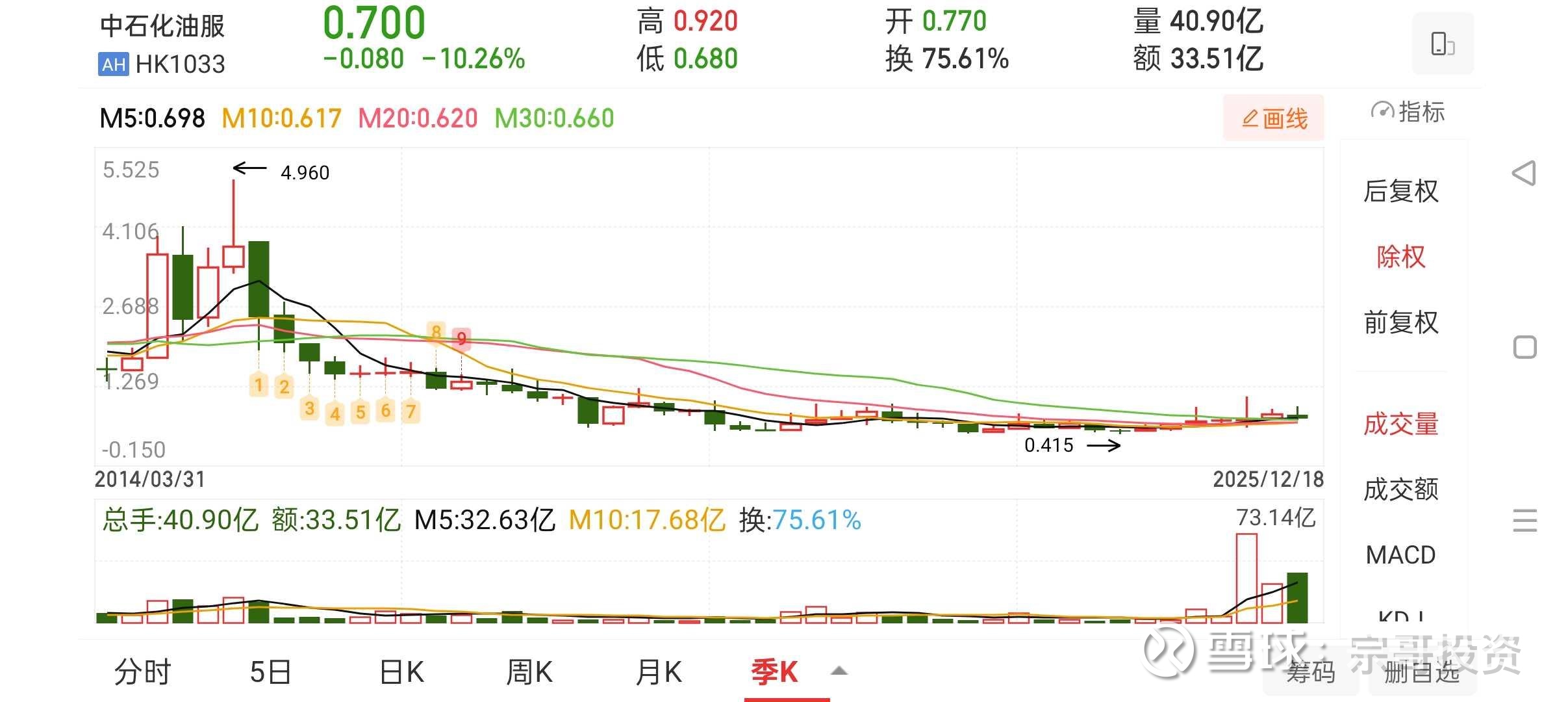 专属熊市周期:2015年4月股价4.96港元,下跌到0.415港元。