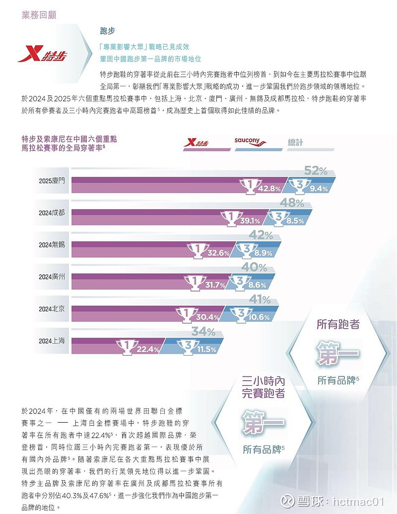 $特步国际(01368)$才知道索康尼(中国)也是特步的,特步这几年在跑圈真打出名堂了,全国破 3 大神中的覆盖率超过 30%,这种专业带动大众的策略也是对的,特步,361 等国产品牌在路跑鞋已经赶超国外品牌。参照老大$安踏体育(02020)$ 对 FILA,迪桑特等并购品牌的培育,索康尼好好开发的话还是蛮有希望成为第二增长点的,毕竟本身就是全球数一数二的路跑鞋品牌。目前动态 pe 在 14 倍左右也不贵,老板正值当打之年,关注看看。