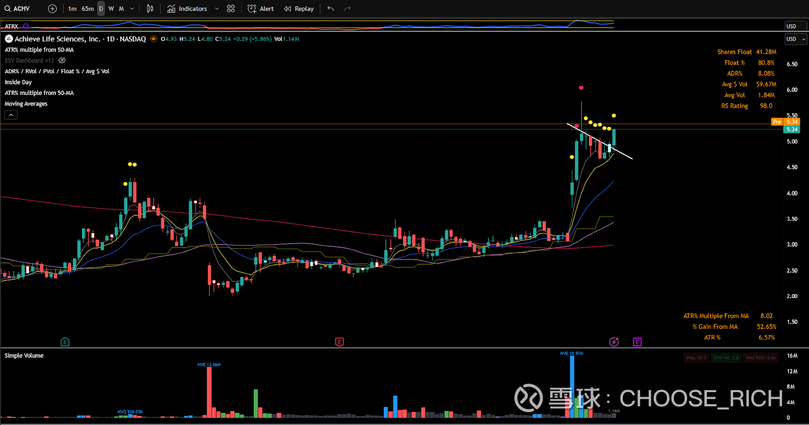 买入$Achieve Life(ACHV)$ ,买入价5.09,止损价LoD 4.80,仓位按risk% of total account =0.24%算,收盘非常好。(为什么买入?一个经典的delayed EP,基本面似乎还可以,B级)