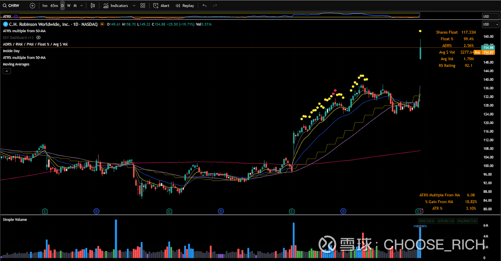 买入$罗宾逊全球物流(CHRW)$ ,买入价157.33,止损价LoD 149.22,仓位按risk% of total account =0.27%算,收盘还不错。(为什么买入?单纯好看的EP,B级)