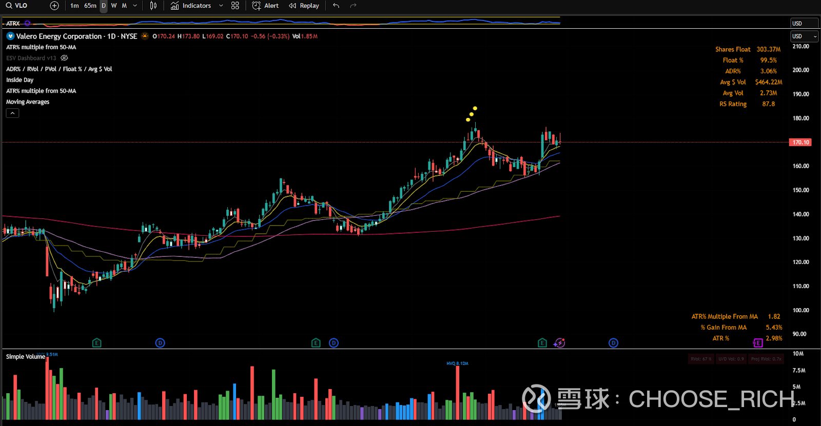 买入VLO,买入价172.22,止损价LoD 169.02,仓位按risk% of total account =0.23%算,收盘很差,可能今天会止损。(为什么买入?PBF/VLO等所有oil相关都在flag,和上次long oil refining的理由相同。看起来oil refining盘中要突破,B级)