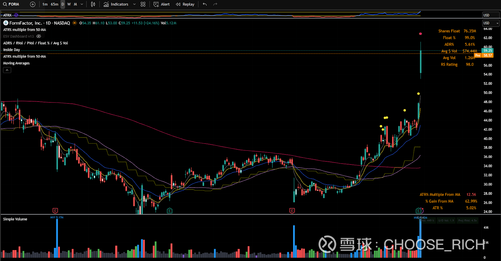 买入$FormFactor(FORM)$ ,买入价56.61,止损价LoD 53,仓位按risk% of total account =0.24%算,收盘很好。(为什么买入?不错的EP,半导体主题,B级)