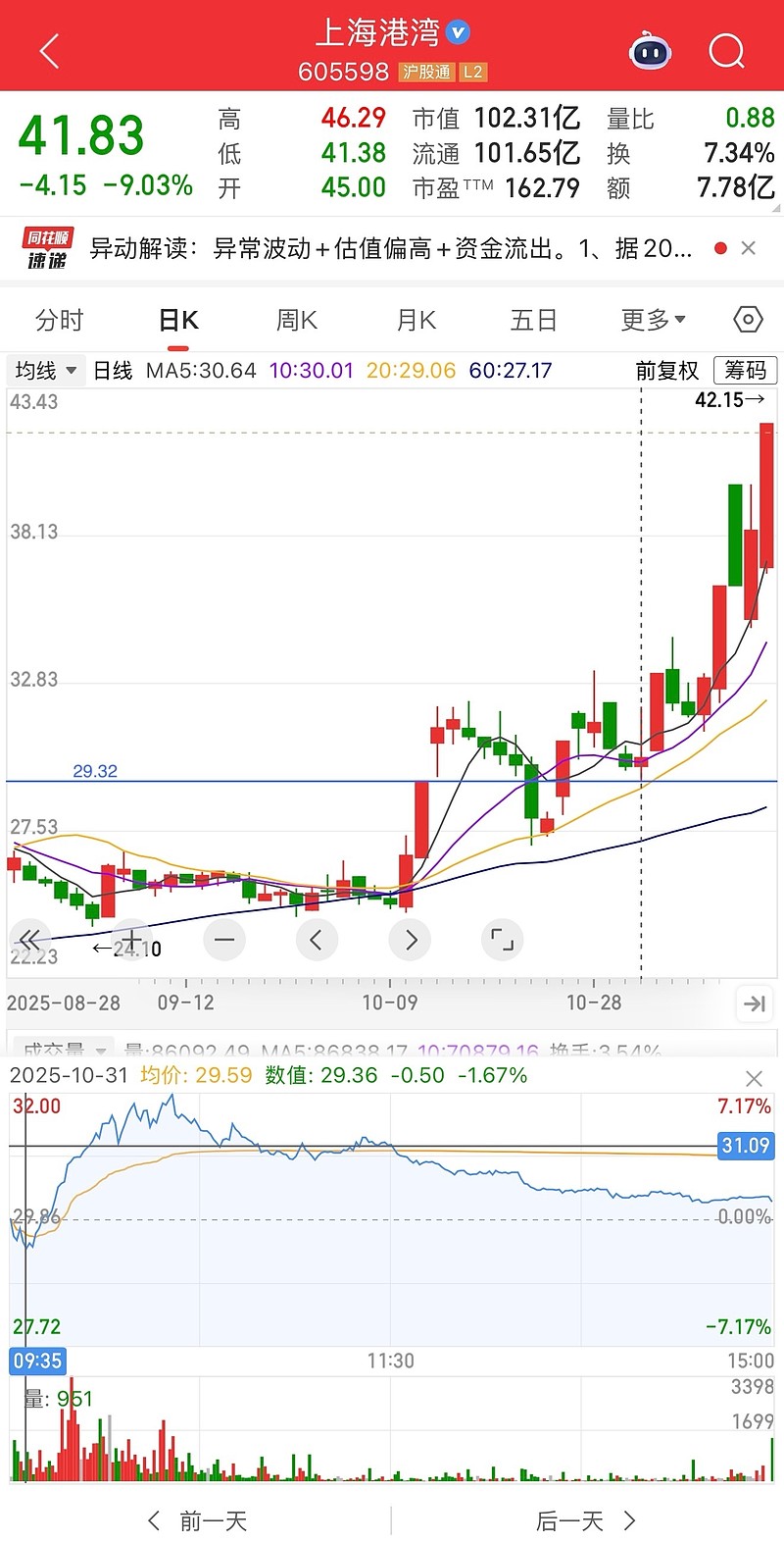 第一个涨停拉高脱离之前的盘整区,而后回踩前期盘整高点;第二个涨停则是主升前的蓄力,10.31的最低点29.29正好刺穿10.13涨停价29.32,打开当日分时图,可以发现这个刺穿是非常极限的,是在当日09:35的时候刺穿,然后急拉回,从此往上。