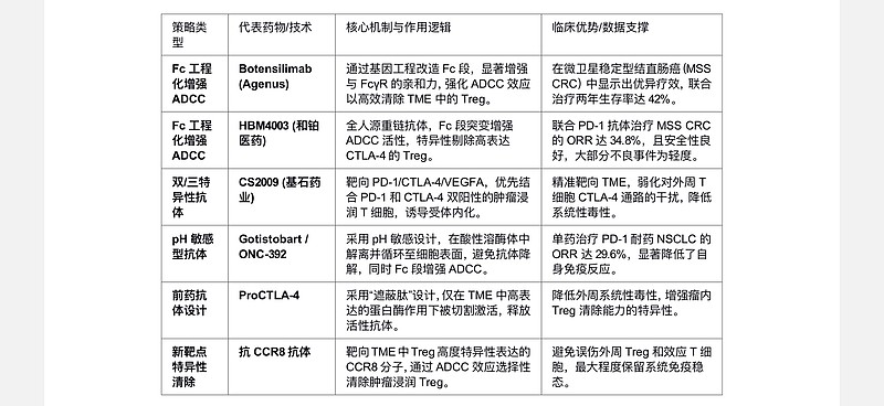 治疗策略演进:针对传统疗法的局限,免疫治疗策略正从单纯的“信号阻断”向“精准清除”演进。新一代药物研发更加重视抗体依赖的细胞介导的细胞毒作用(ADCC),旨在利用TME中Treg细胞高表达CTLA-4、CCR8等分子的特性,通过Fc段工程化改造增强对NK细胞等效应细胞的招募,特异性清除肿瘤浸润Treg细胞。这一策略的核心逻辑在于:通过精准清除TME中的免疫抑制性Treg细胞来打破免疫耐受,同时保留外周Treg功能以维持系统免疫稳态,从而实现“增效减毒”。坂口志文等学者的研究也支持这一观点,认为靶向CTLA-4的核心机制在于清除TME中的Treg,而非单纯的“松刹车”。