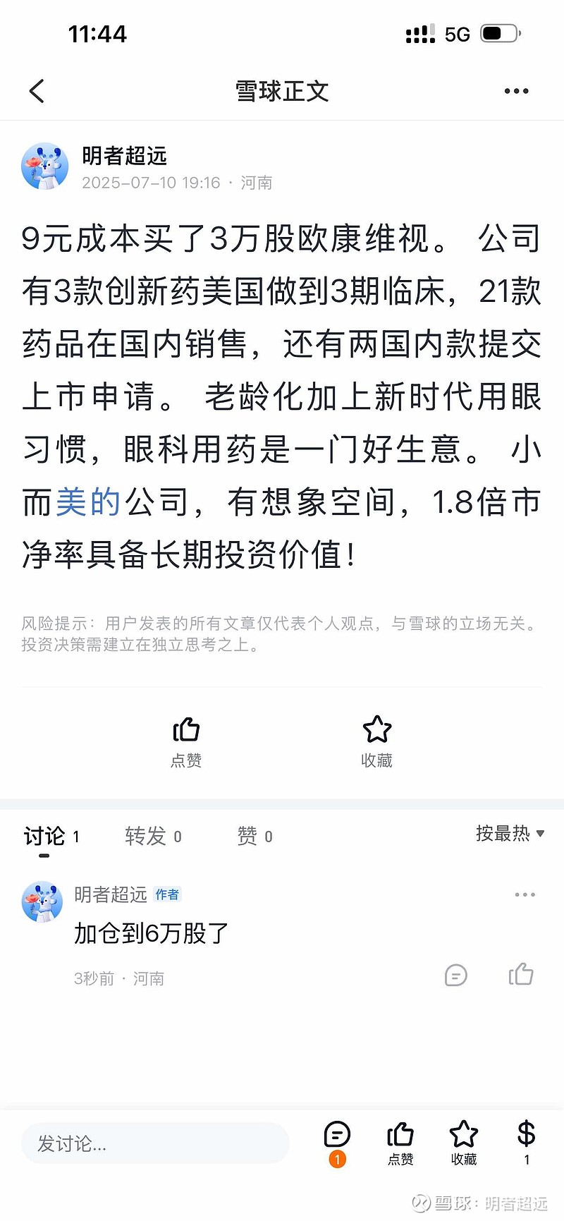 前 加仓到 6万股 欧康维视 ,被套10%左右 。长期持有,观点不变!