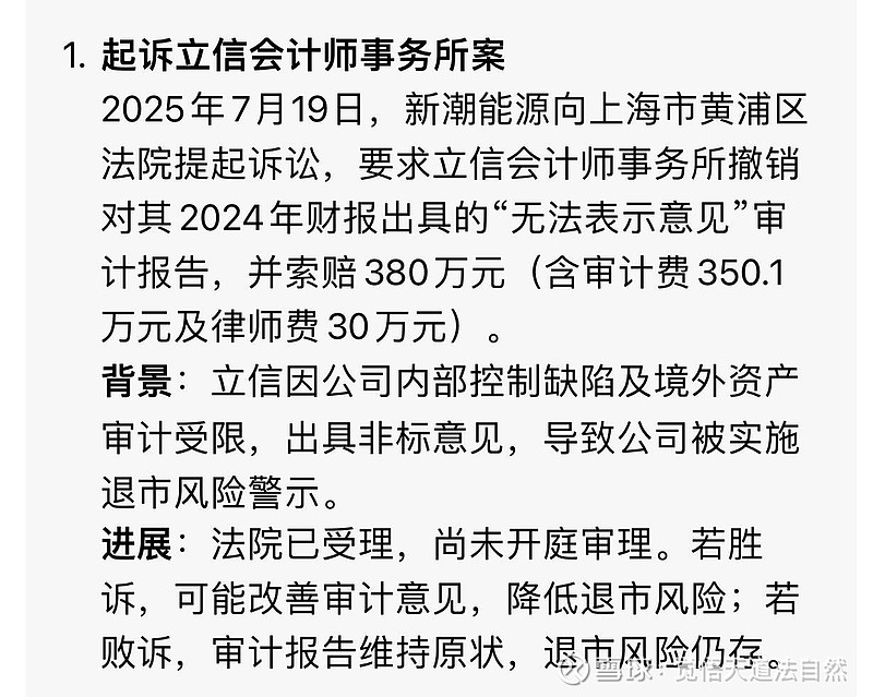 新潮起诉立信看下图:已九月份就开完庭只是没有宣判,如果能赢最好年内有望摘帽,输了也没有关系审计公司都换了只要 25 的年报,明年按时披露出来就行。