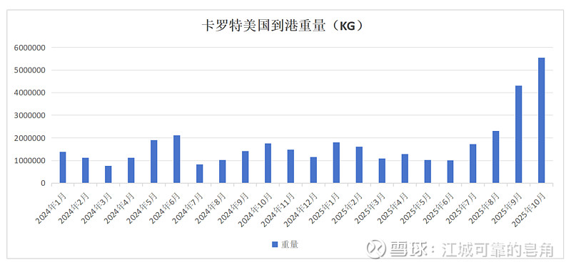 考虑到23年及之前存在进出主体均难以追踪的情况,故该数据统计自24年开始,呈现的是卡罗特向所有美国相关实体出口厨具类产品的到港重量,单位为KG,个人名誉为这份数据的准确性和真实性担保。