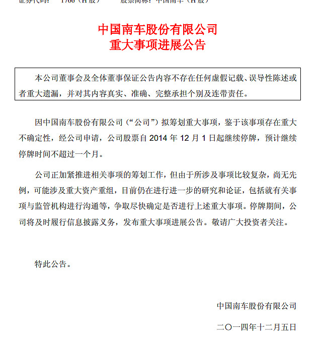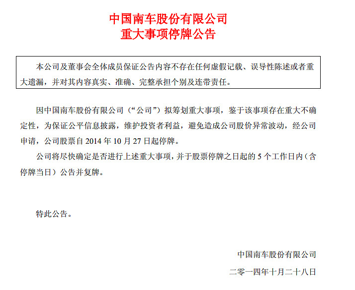 2014年10月28日,中车(彼时叫南车)公告筹划重大事项,停牌。