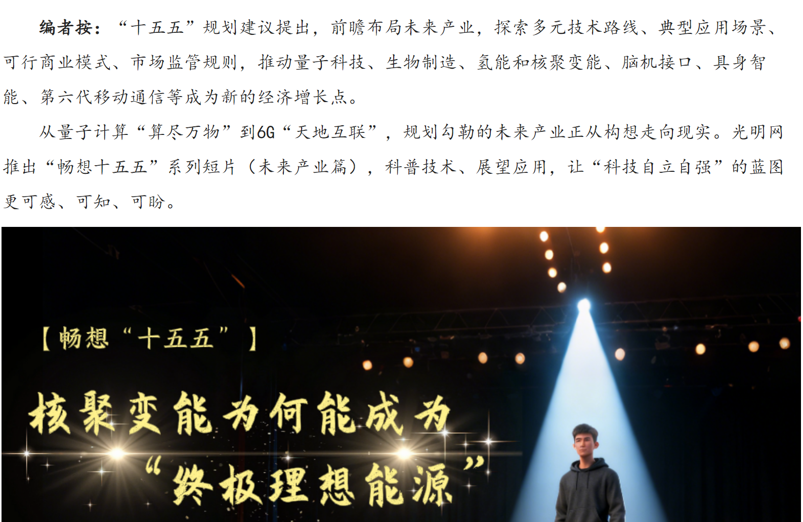 “十五五”重点布局这项产业,核心出于三方面考量。一是能源转型刚需,核聚变能作为稳定的零碳能源,是理想解决方案。二是保障能源安全,依托国内丰富的氘资源,增强能源自主可控能力。三是培育产业增量,预计“十五五”期间将激活万亿级市场空间。