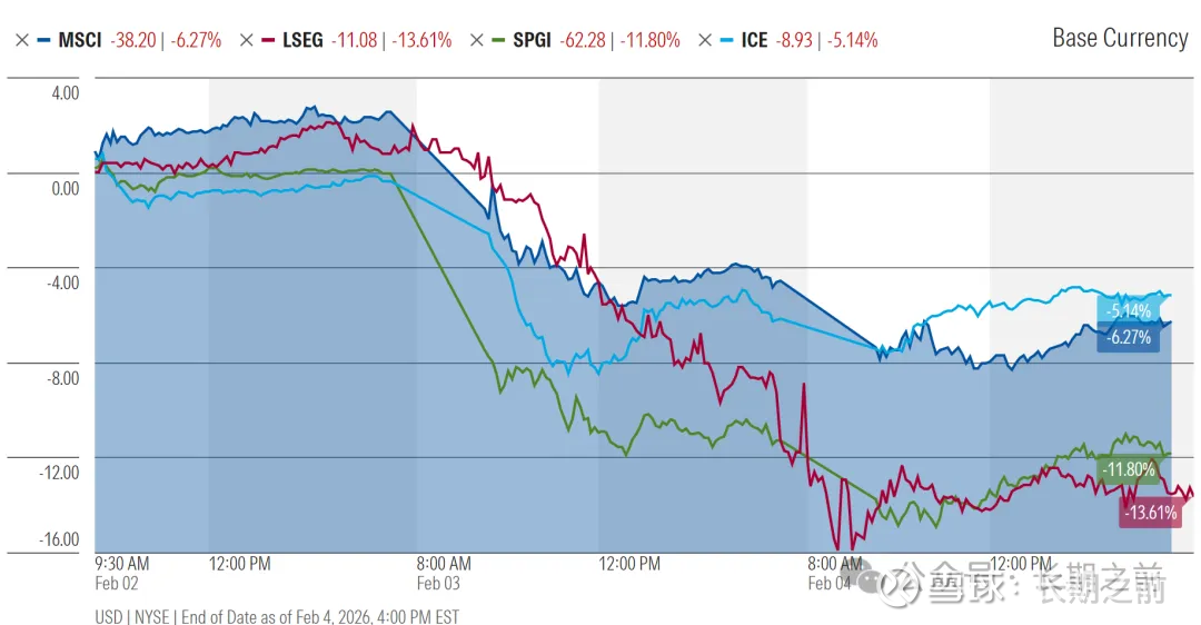 软件行业的下跌关联带垮了金融信息服务。标普国际、洲际交易所、伦敦交易所、MSCI等跟随在2月3日惊魂一跳,盘中跌幅都超过10%。这些公司一方面提供金融市场数据,同时提供数据分析和风险分析软件服务。洲际交易所和MSCI因为拥有自主数据,很快开始反弹,但伦交所(拥有refinitive)和标普国际主要提供金融信息和分析,受的冲击相对更大。当然这个下跌应该是情绪推动:先卖了再说。