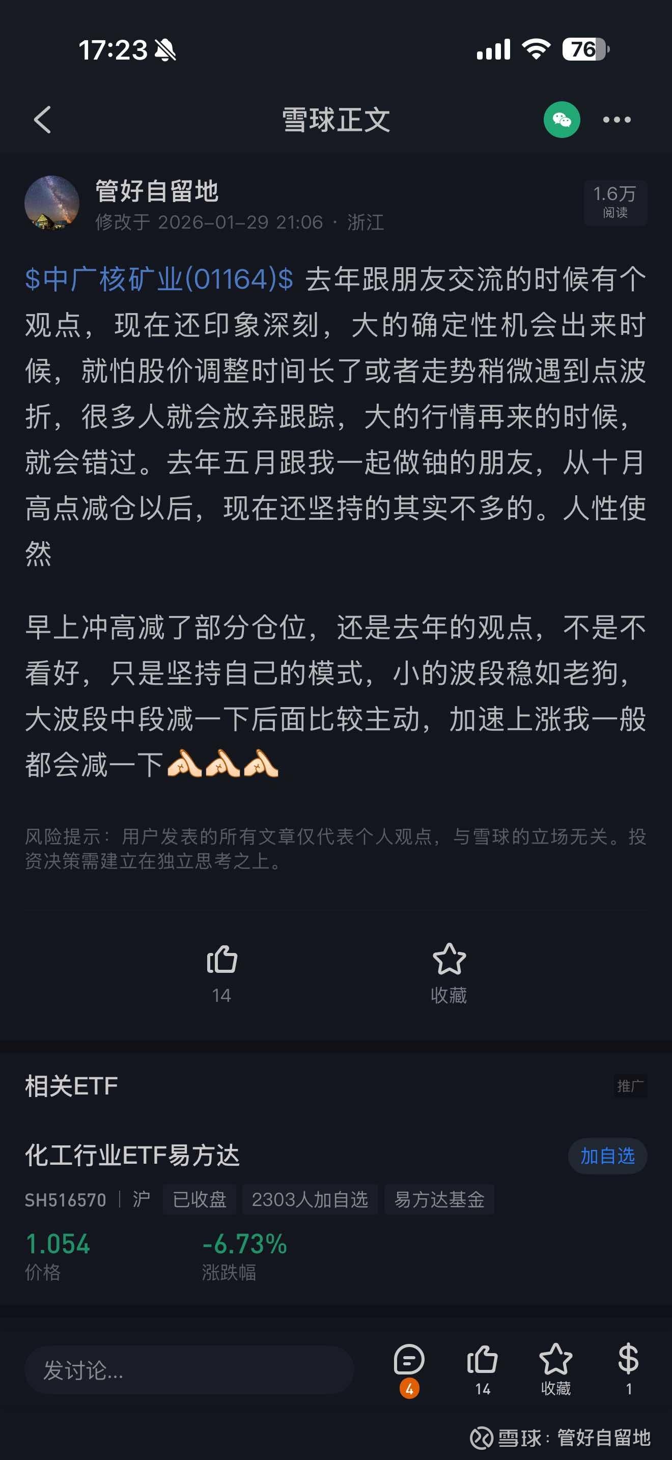 $中广核矿业(01164)$ $中国铀业(SZ001280)$ 上周都有减仓吗,自己的交易纪律目前来看是成功的,但也要记得找机会买回来啊现在是高波动阶段,泥沙俱下,等波动率降低今天有个大佬说这轮铀没跑出超额来,其实都是大beta,但我觉得还是坚信铀能走出独立行情