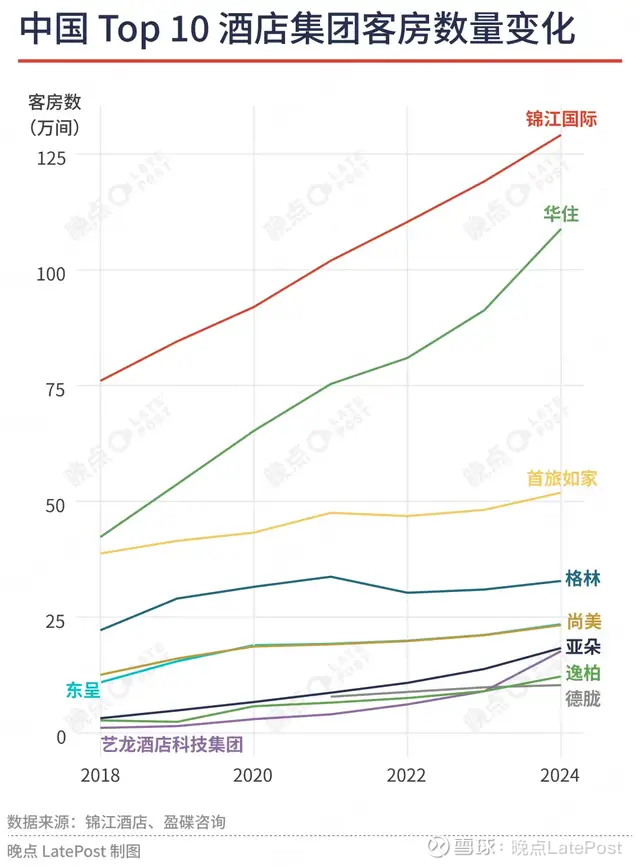 2008 年全球金融危机后,锦江抓住投资机构退出的机会,收购卢浮(Louvre)酒店集团,后又从海航手中接过丽笙(Radisson)酒店集团,成为在海外拥有约 2000 家酒店(主要在欧洲、亚太)的全球化品牌。2010 年代民营经济蓬勃,锦江又并购了经营 7 天酒店品牌的铂涛集团和华南地区颇受欢迎的维也纳酒店集团,抓住了经济型酒店和中端酒店的扩张机会,在 2016 年成为中国酒店数量最多的酒店集团。
