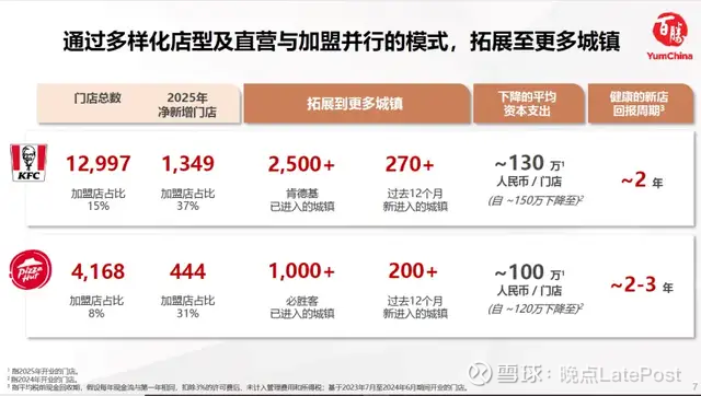 开店门槛降低以及健康的投资回报周期带动了加盟门店数量的增长。2025 年百胜中国净新增门店 1706 家,肯德基与必胜客门店的净新增门店加盟占比从 25% 提升至 36%。