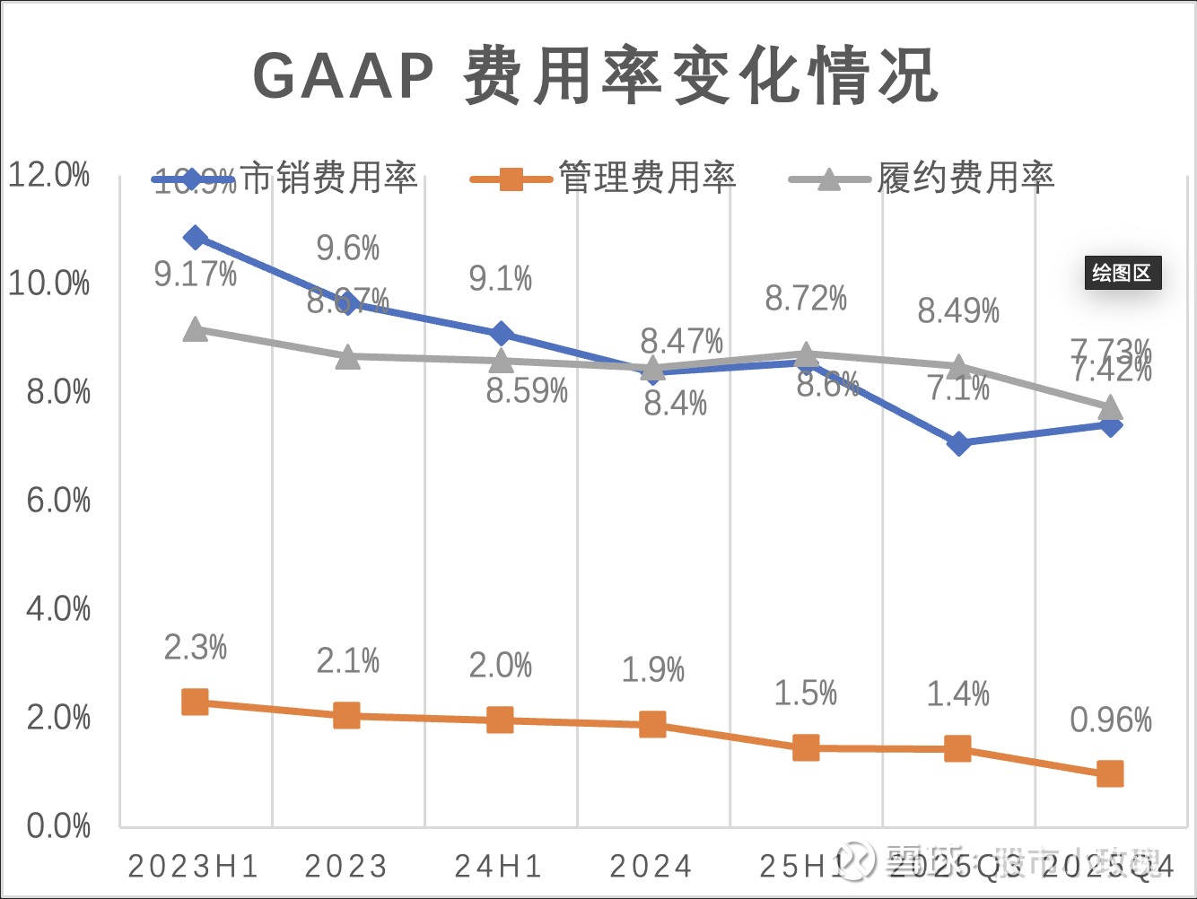 由于无形资产逐渐摊销殆尽、股份激励减少,GAAP口径下25年履约费用率、销售费用率管理费用率均保持下降趋势;