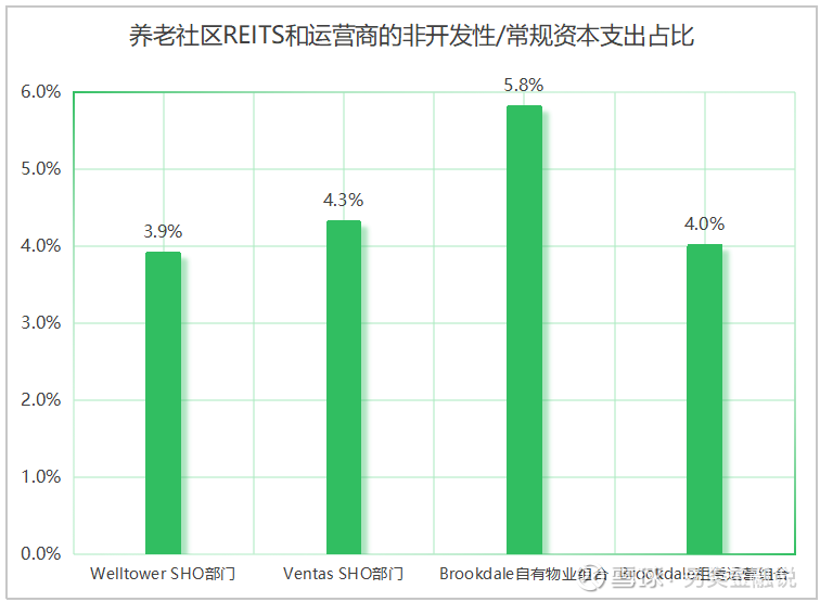 与Welltower相比,Ventas在系统开发等方面的资本投入较少,2024年公司整体的非开发性资本支出总额为2.54亿美元,占到收入总额的5.7%;其中,SHO部门物业层面的非开发性/常规资本支出约1.43亿美元,占到部门业务收入的4.3%。
