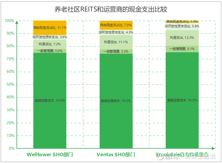 综上,由于养老社区运营商在自有自营模式下的NOI利润率并不占优,而一般管理费占比和利息支出的占比又都更高,结果,养老社区运营商在自有自营模式下的自由现金流占比显著逊于REITS机构的SHO部门。