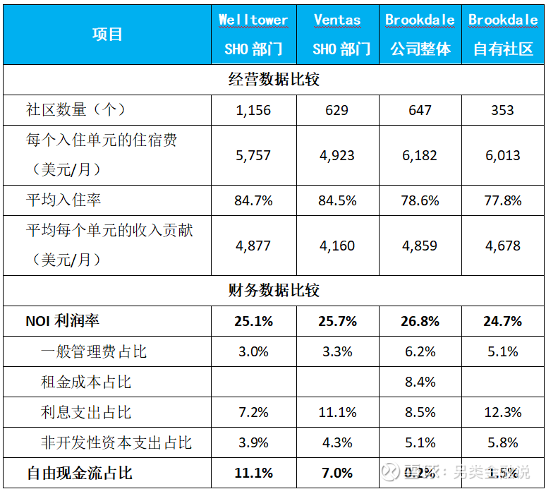 为了能够更好的比较不同投资运营模式下的经营数据、财务状况和资本市场表现,我们选取全美最大康养REIT Welltower、第二大康养REIT Ventas、及全美最大养老社区运营商Brookdale在2024年的数据进行比较。