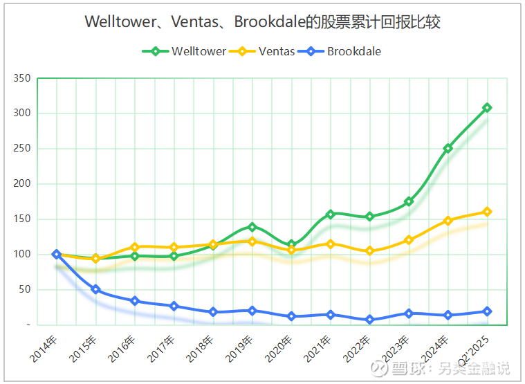 结果,截至2024年底,Welltower的股价隐含资本化率(即,股票投资人要求的当期回报率)仅为2.6%;而Ventas的股价隐含资本化率为5.2%,是Welltower的两倍;至于Brookdale,截至2024年底,以市值计算,其负债率达到80%,剔除租金后的股价隐含资本化率达到10.8%,股权融资成本显著高于Welltower等REITS机构。