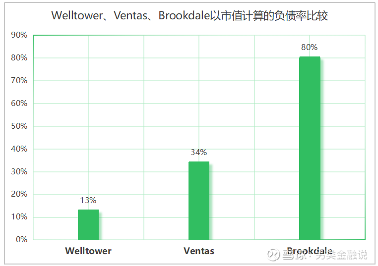 2.3.5 资本结构的比较:Welltower的负债率仅为13%,而Brookdale则高达80%