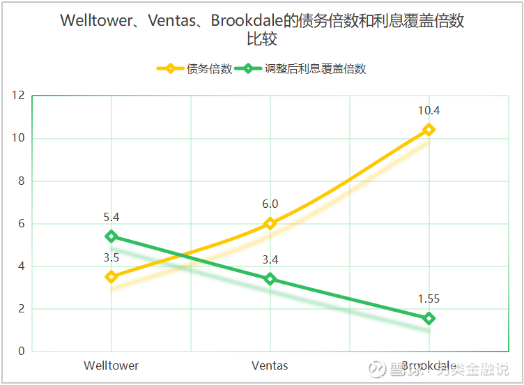 图2.11 Welltower、Ventas、Brookdale的债务倍数和利息覆盖倍数比较